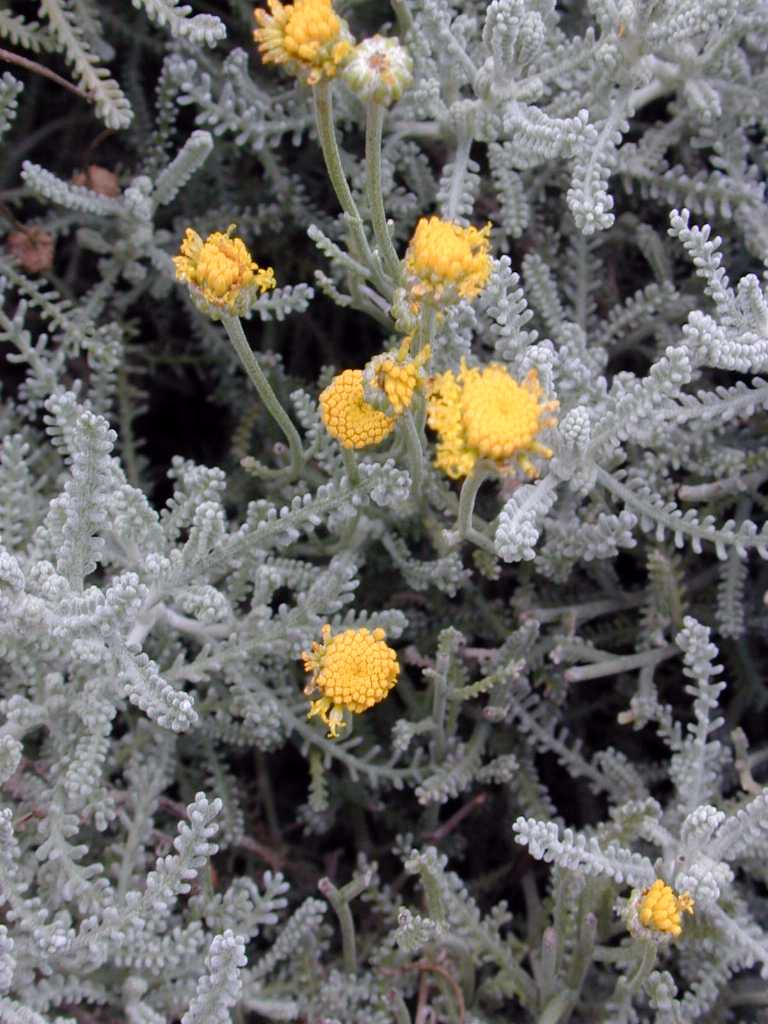 The flowers of the Santolina are bright yellow, coming in summer on plants that haven't been sheared.