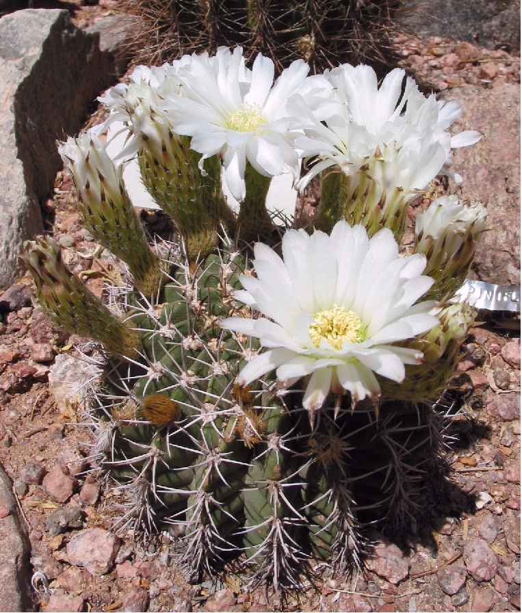 The Acanthocalycium spiniflorum has white to violet flowers in summer (the pink flowers justified the forma violacea). The flowers measure 1.5 inches in diameter (4 cm) or more. Even when not blooming, the attractive spination makes it an interesting cactus.