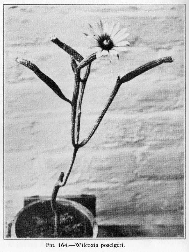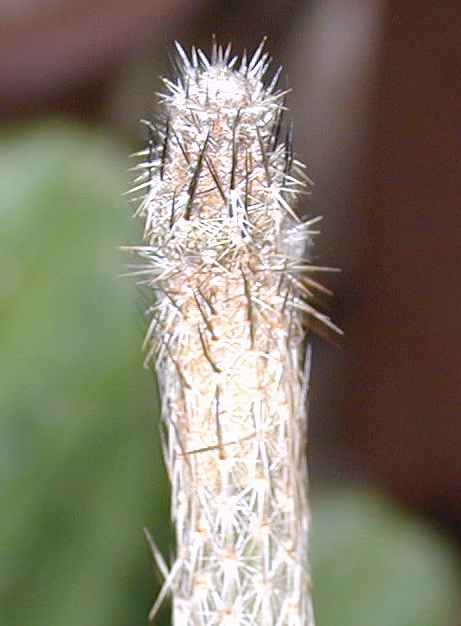 Growth Habits: Shrubby, long thin erect stems arising from a tuberous root system (photo 2), dark green stems up to 4 feet long (1.2 m), 0.8 in. in diameter (2 cm); 8 to 10 shallow ribs; close-set areoles 1.5 to 3 mm apart, with greyish white spines; 1 central spine, enlarged at its base, 4mm long; 9-12 straight radials