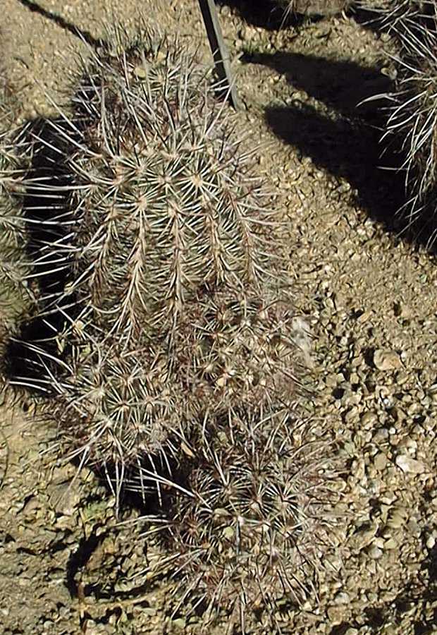 Growth Habits: Cylidrical dark green stems, solitary or clustering, up to 8 inches tall (20 cm), up to 3 inches wide (7 cm); 13 obtuse ribs; 0 to 3 centrals, up to 0.8 inch long (2 cm); 15 stiff radials, up to 0.4 inch long (1 cm).