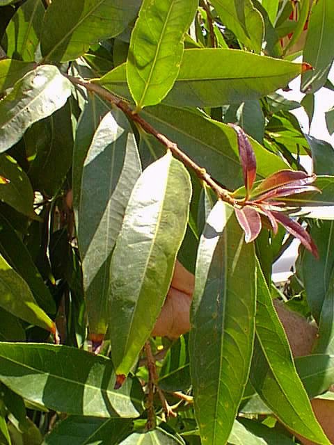 The Rose Apple, native to the East Indies, forms a handsome evergreen tree 25 to 30 feet high, which is prized as an ornamental. The glossy, leathery leaves are lanceolate and pointed, being 6 to 8 inches in length (15-20 cm) and 2 inches or less (5 cm) in width. The new leaves are wine colored and gradually turn to the characteristic dark green at maturity.